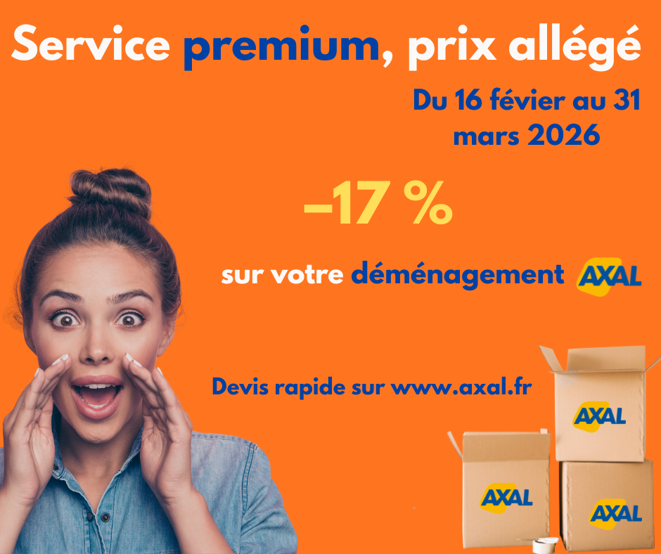 Pour tout déménagement AXAL devisé du lundi 16 février au mardi 31 mars 2026 et dont la livraison aura lieu en semaine jusqu’au 15 avril 2026, une remise de 17 % sera appliquée au tarif général AXAL, sous réserve de signature du devis le jour de la visite commerciale